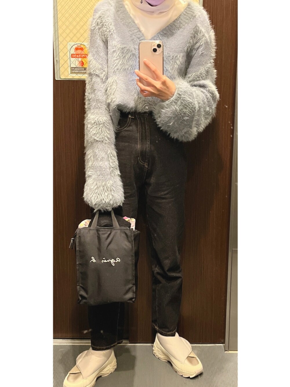春らしい淡い色のふわふわカーディガン🍀 ハイウエストデニムなので前部分だけインして足長効果…👖✨ カジュアルなコーデがやっぱり好き🥺❤️ スニーカー➡︎23.5cm