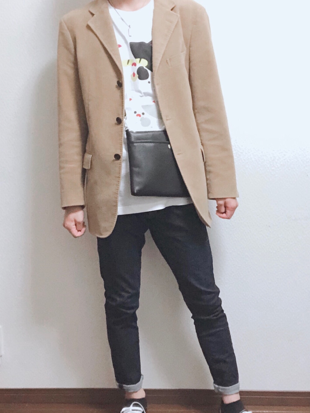 投稿見てくださりありがとうございます。 今回は僕の趣味を前面に出したコーデとなっております笑 プリントTは僕の好きなゲームのスプラトゥーンとUNIQLOのコラボ商品で割と気に入ってます(オタクに見られそうですが、オタクなので気にしません笑) テーラードジャケットは古着屋で購入しました! 個人的にテーラードジャケットとプリントTを合わせるとフォーマル過ぎず、カジュアル過ぎずな感じがして良いと思ってます。