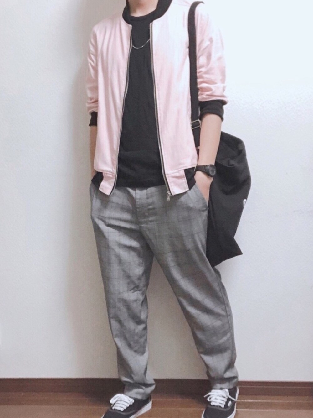 いいね、お気に入り、そして投稿を見てくださりありがとうございます。 今回は令和ピンクということでピンク色を取り入れたコーデを組んでみました!🌸 ちょうどグレーのチェックパンツを持っていたのでそれと合わせてみて、可愛くなりすぎないように黒系のアイテム多めに取り入れました!