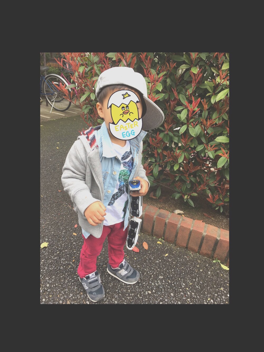 靴反対はいてます。 赤ズボンのコーデって、難しい…🙀 プラレール離しません😂