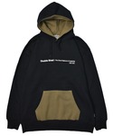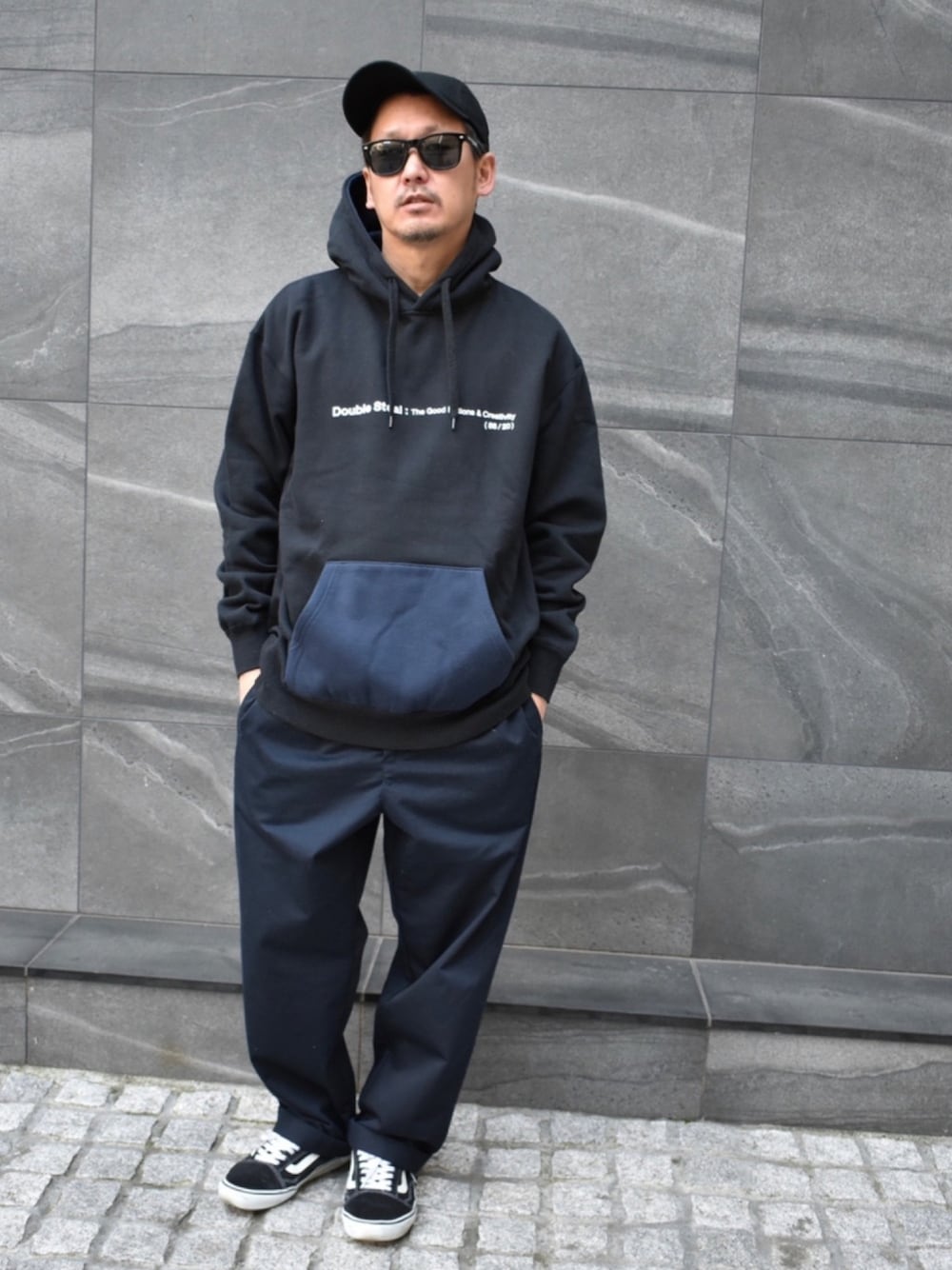 ブラックxネイビーのワントーンコーデ ネイビーのシェフパンツはウエストゴムで履きやすい シルエットもゆったり パーカーは裏起毛の素材 カンガルーポケットもフードの中がネイビーで配色に