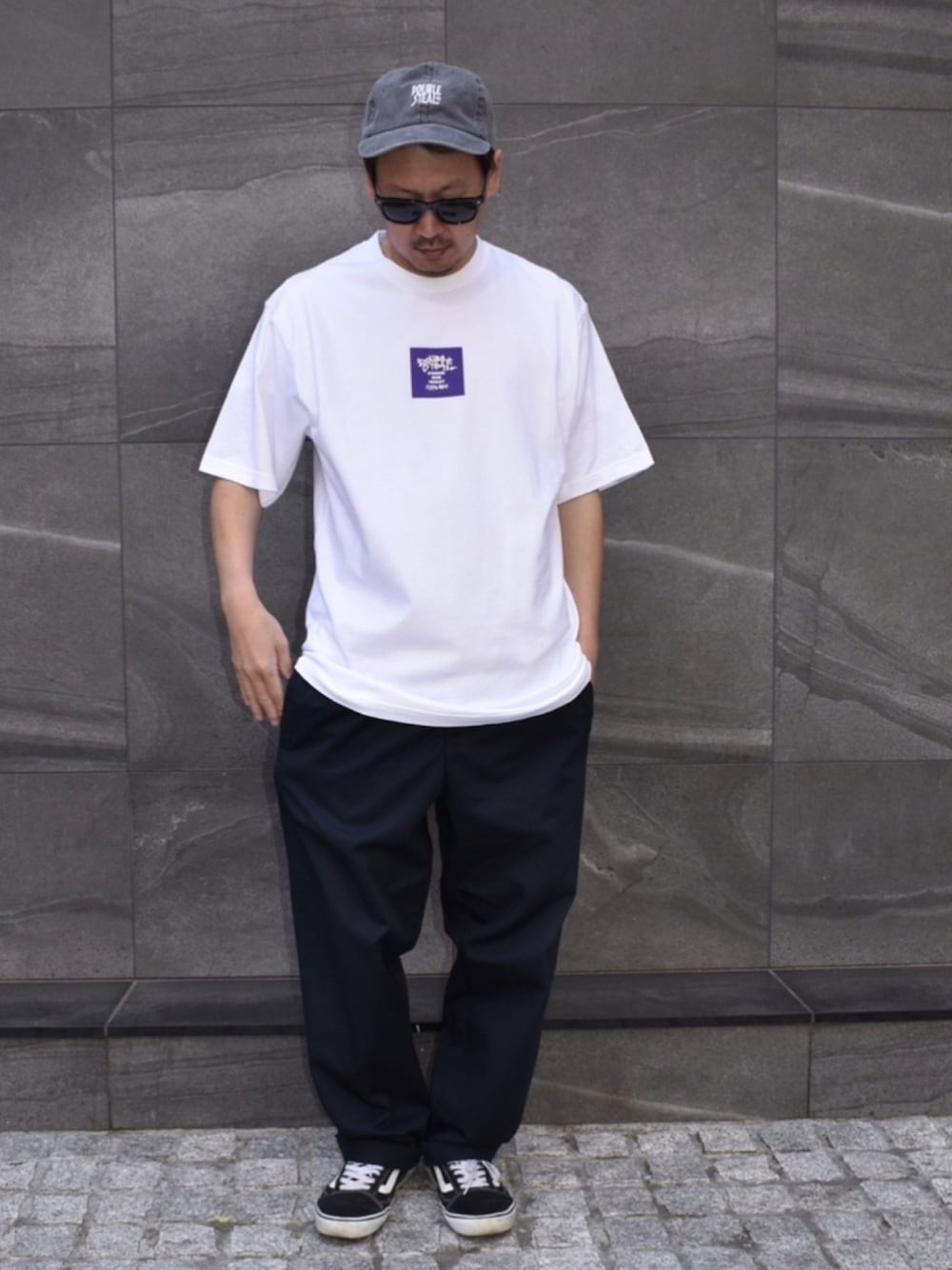 Tシャツはスクエアの中に定番のタギングロゴを配置した定番のtシャツ。 カラバリも豊富! パンツはシェフパンツで カラーはネイビー。 ウエストゴム仕様で履きやすい。