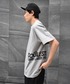Tシャツはサイドにプリント入り、カラーはストーングレー ネイビーのシェフパンツ