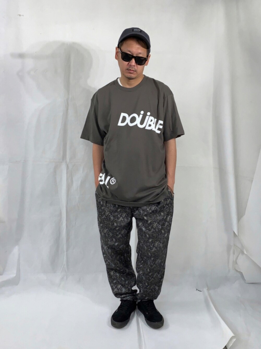 グレー チャコール系 ペイズリーの、パンツ ランダムにロゴな入ったTシャツ ネーム付きcap