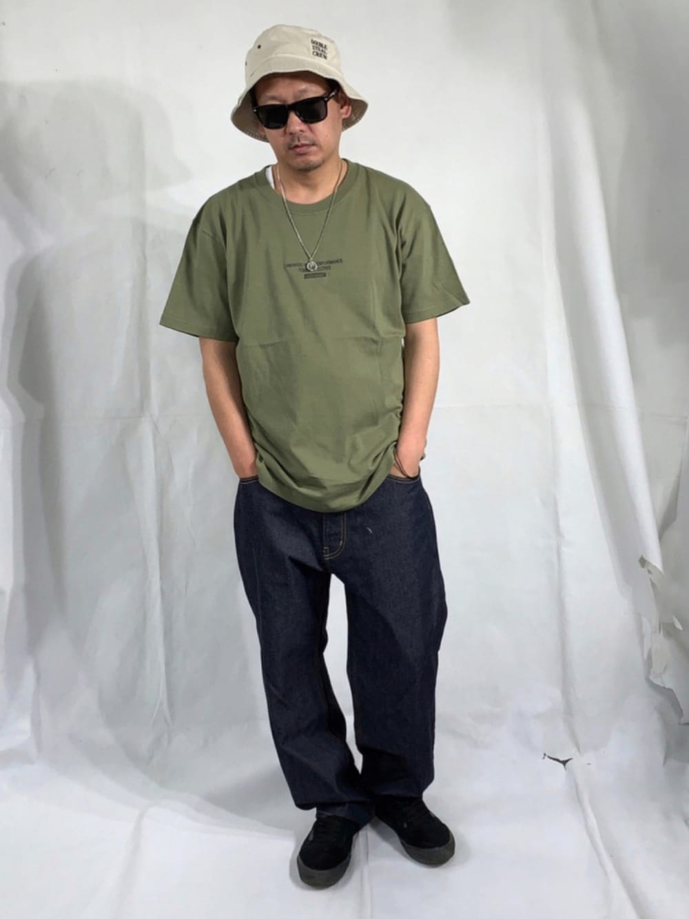 Tシャツはヘビーウェイトで 真ん中に同色の刺繍が入ってます。 ベージュのハット 人気のコインネックレス サングラスに インディゴデニムパンツ