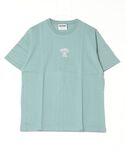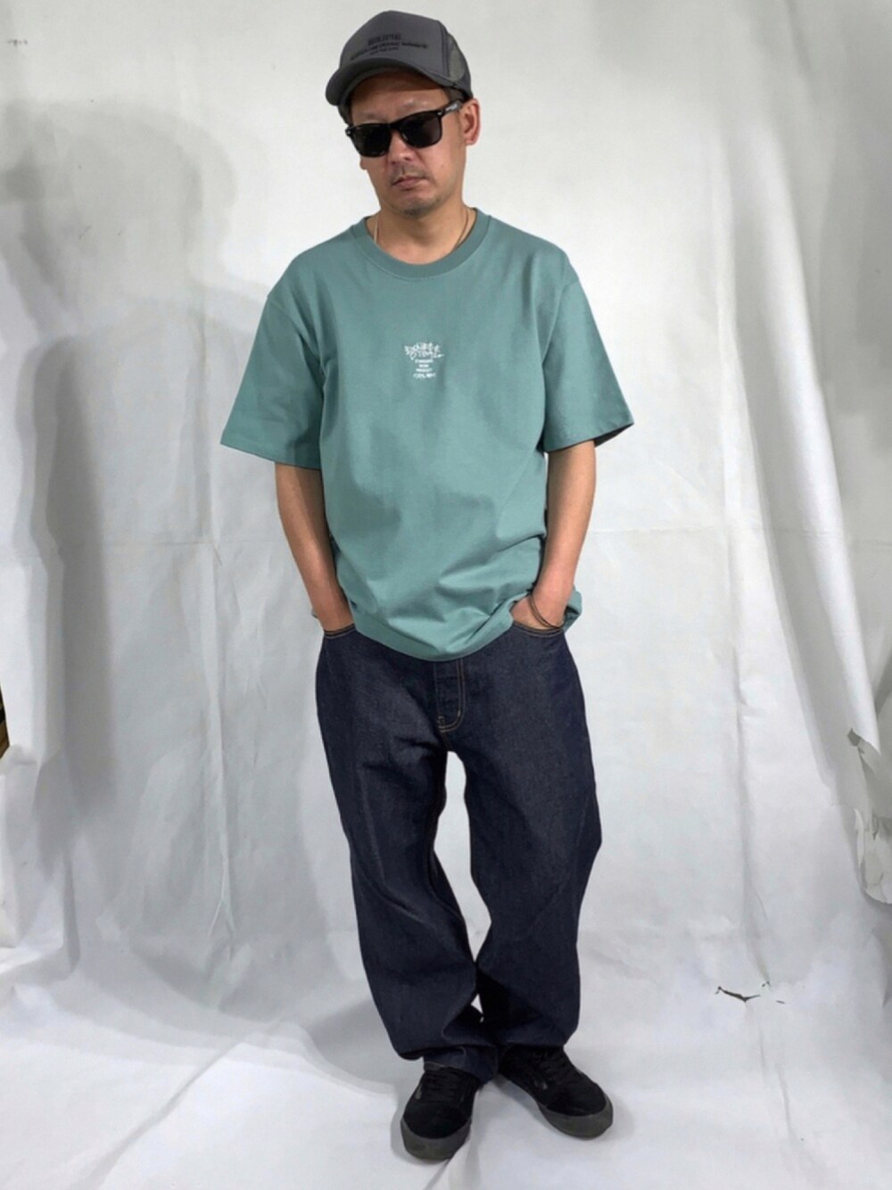 極厚 ベビーウエストのTシャツ フロント ワンポイント刺繍でシンプル キャップは チャコールカラーのメッシュキャップ パンツは ゆったりシルエットのデニム。