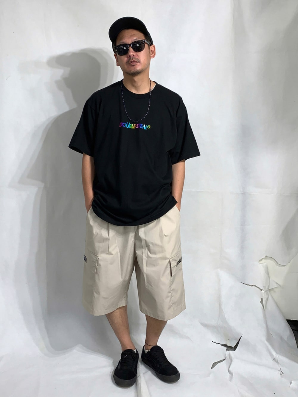 まだまだ暑い、、、 Tシャツは ロゴが箔プリントになってます。 レインボーカラーです。 ショートパンツは カーゴタイプ シルエットはワイドで ウエストゴム仕様、 ネックレスはビーズ サングラス キャップ
