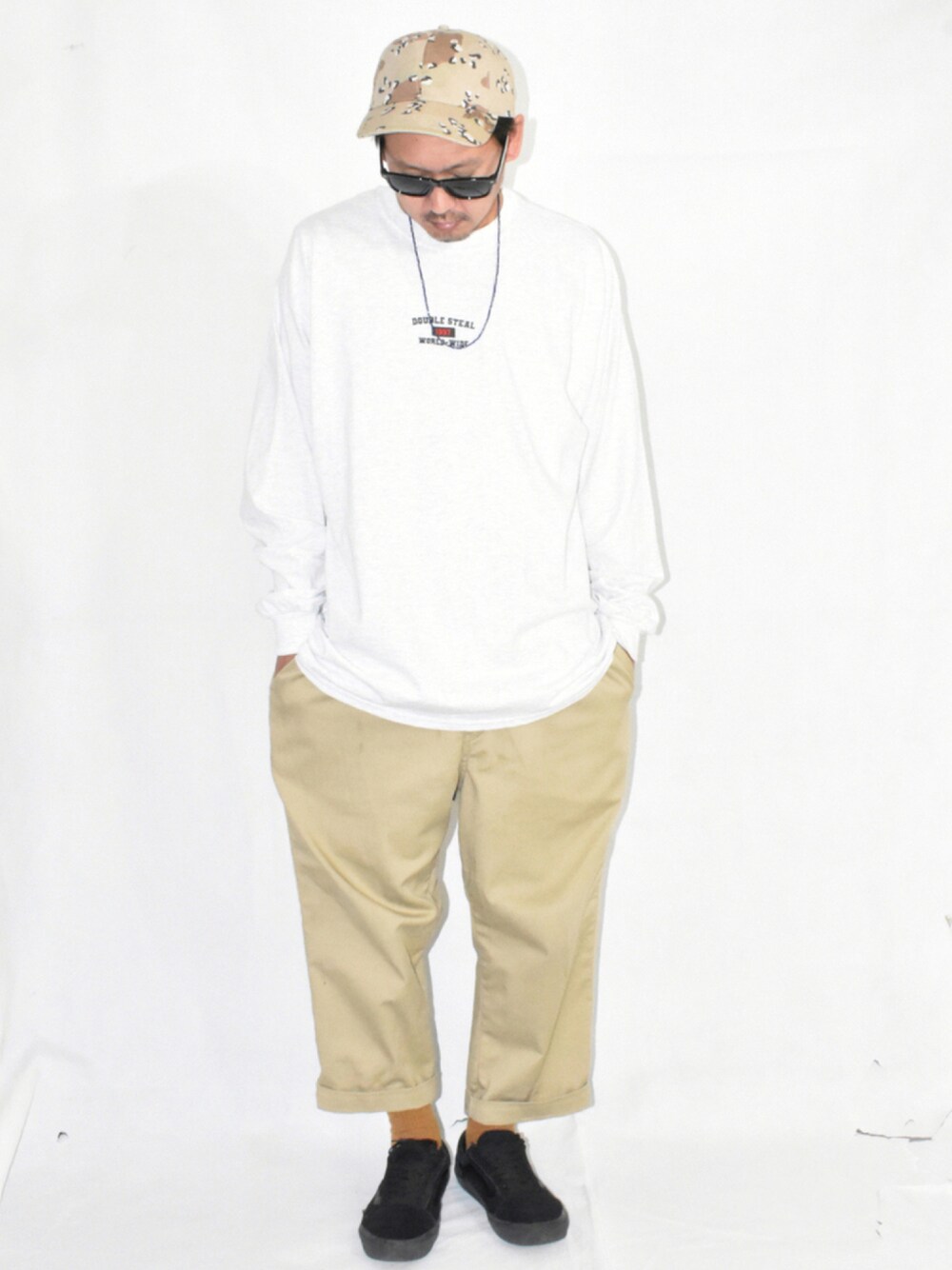 新作のロンT フロントのロゴが刺繍 ネックレスはブルー サングラス 迷彩のキャップ
