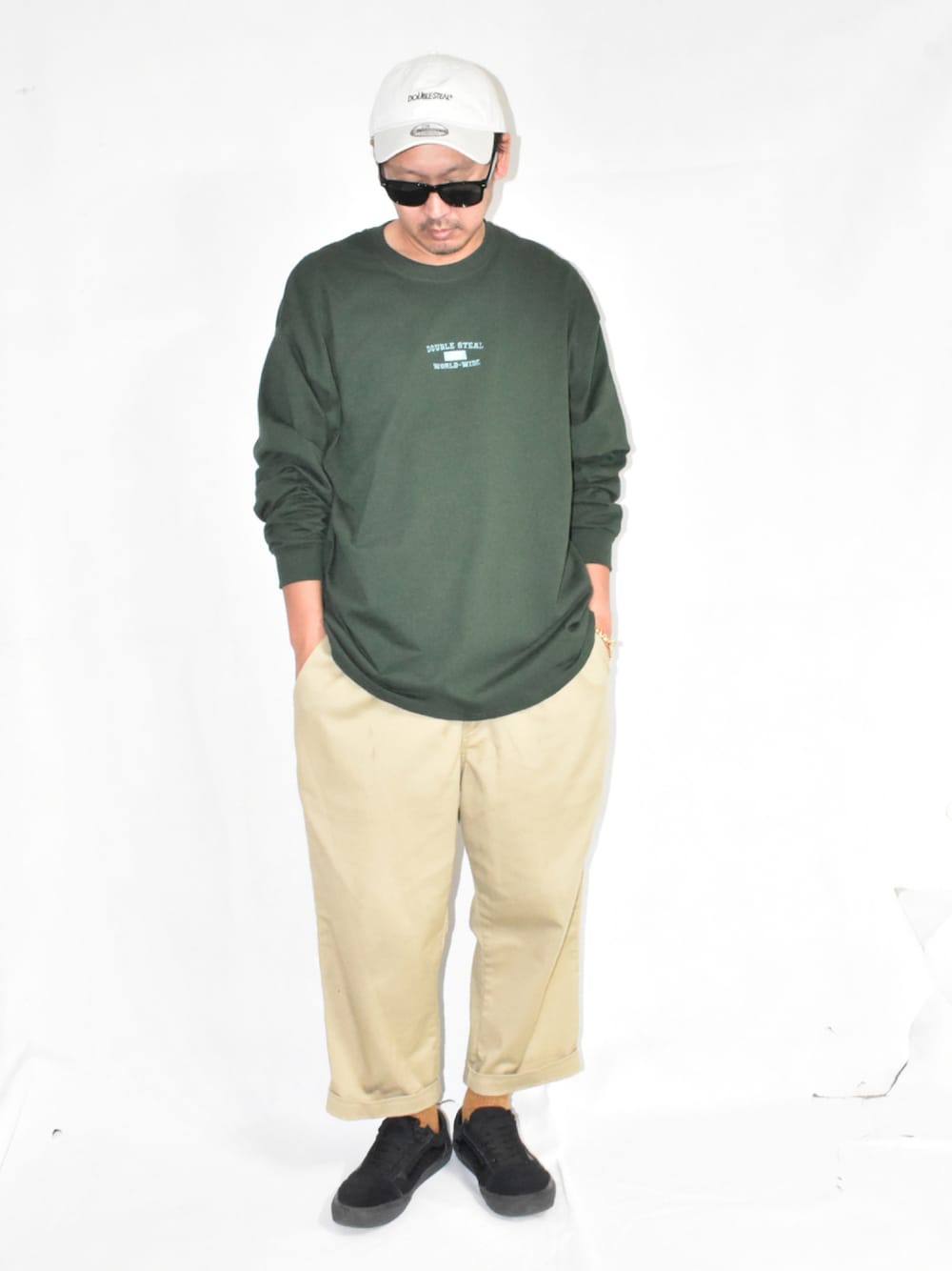 胸にワンポイントでロゴ 刺繍、 ベージュチノパンに グリーンのロンT
