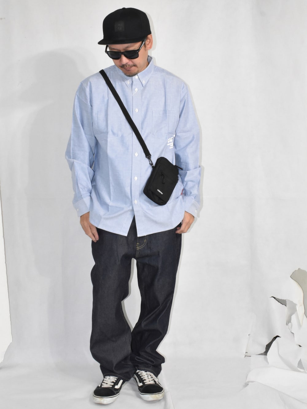 オックスシャツ ポケット下にロゴ プリント入り デニムパンツ ミニショルダーバッグ サングラス キャップ