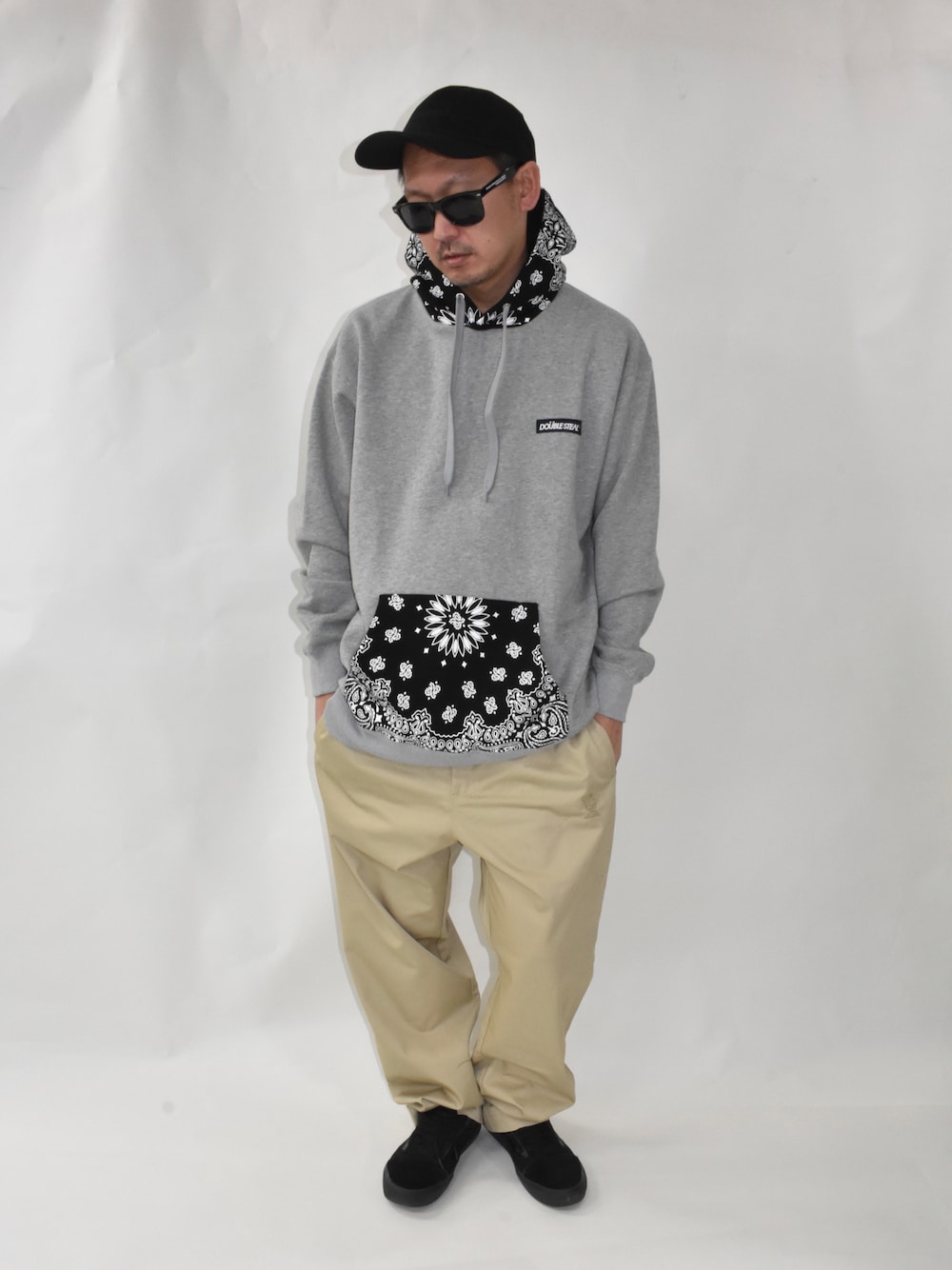 ベージュのシェフパンツに ペイズリー柄のパーカー