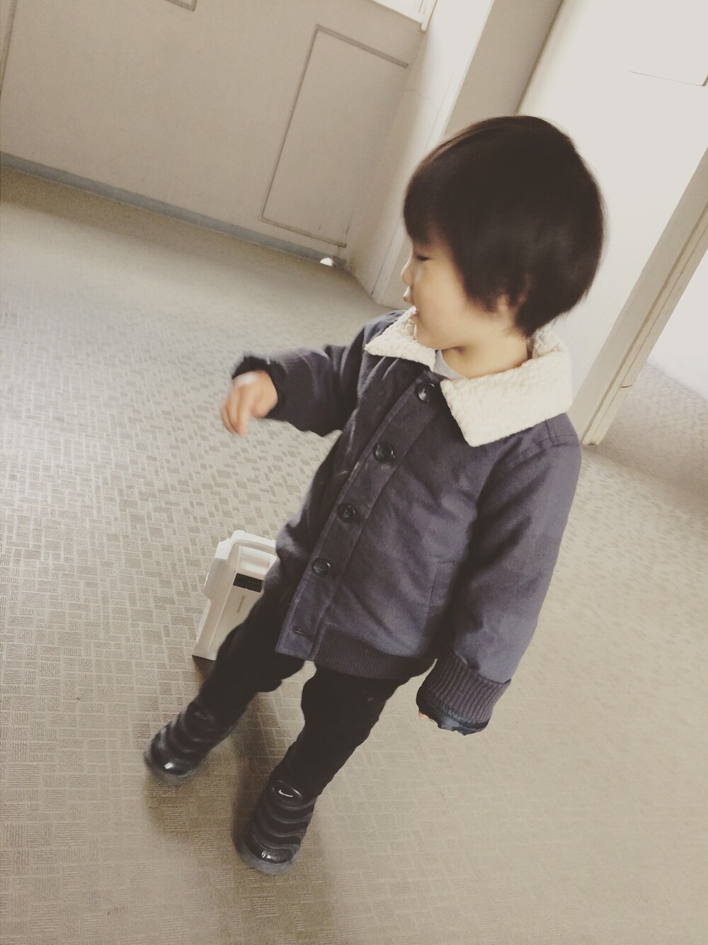 グレー系のジャケット/アウター、ブラック系のパンツを着用したキッズの冬コーディネートの1枚目の写真