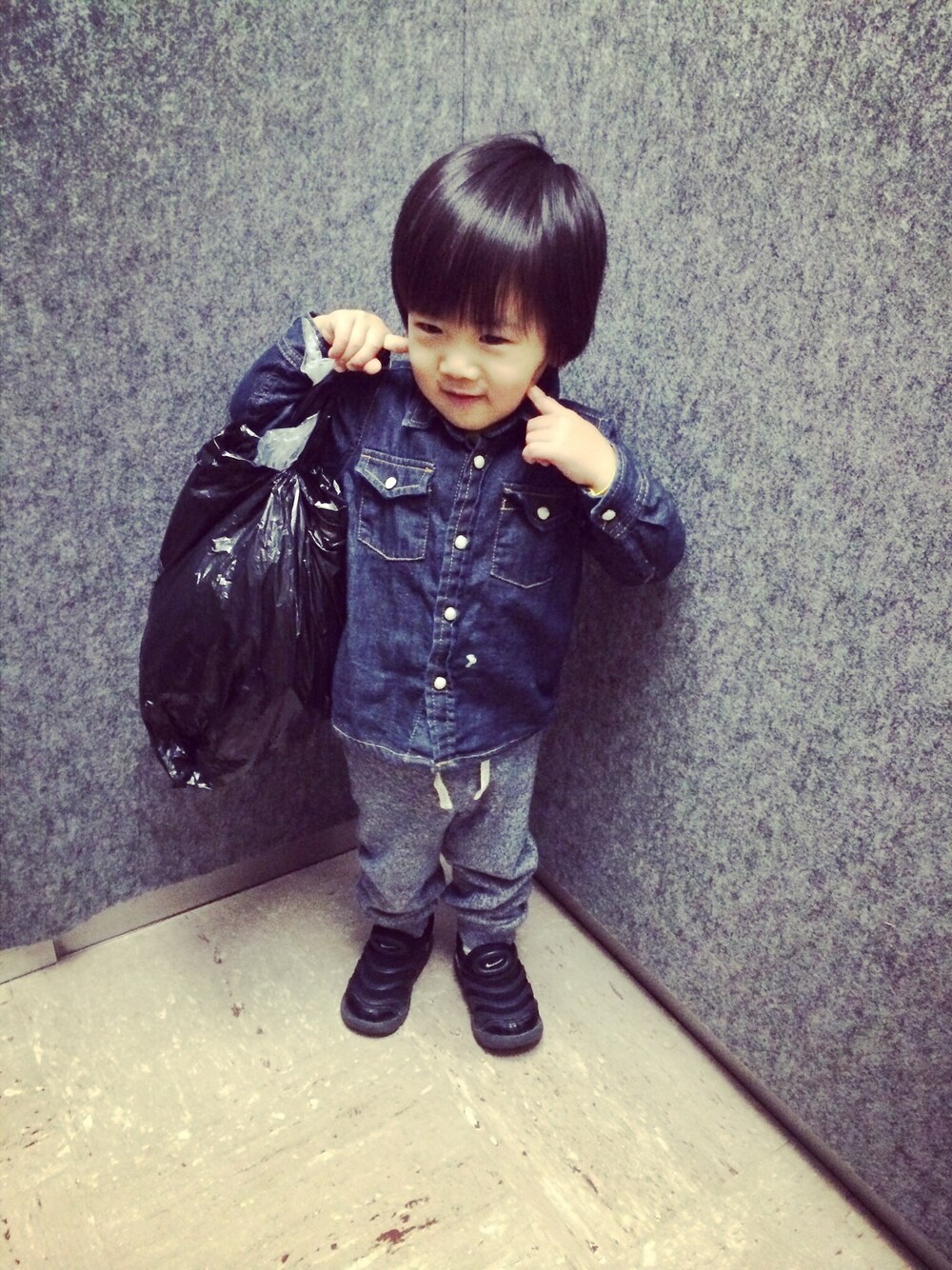 ブルー系のシャツ/ブラウス、グレー系のその他パンツを着用したキッズの冬コーディネートの1枚目の写真