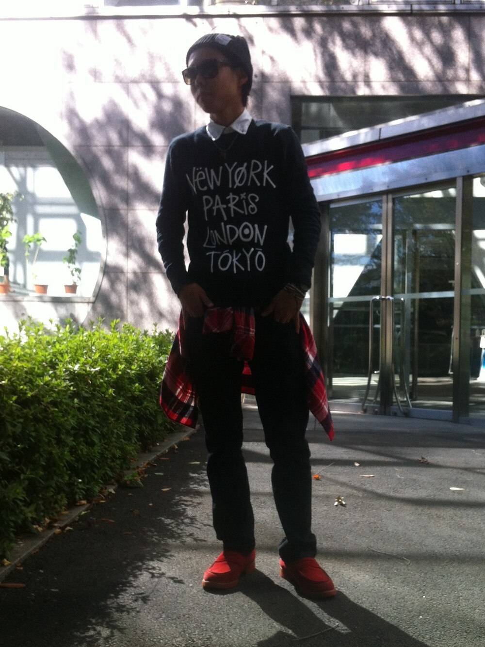 黒コーデ 赤のネルシャツを腰巻きして差し色にするのがポイント!