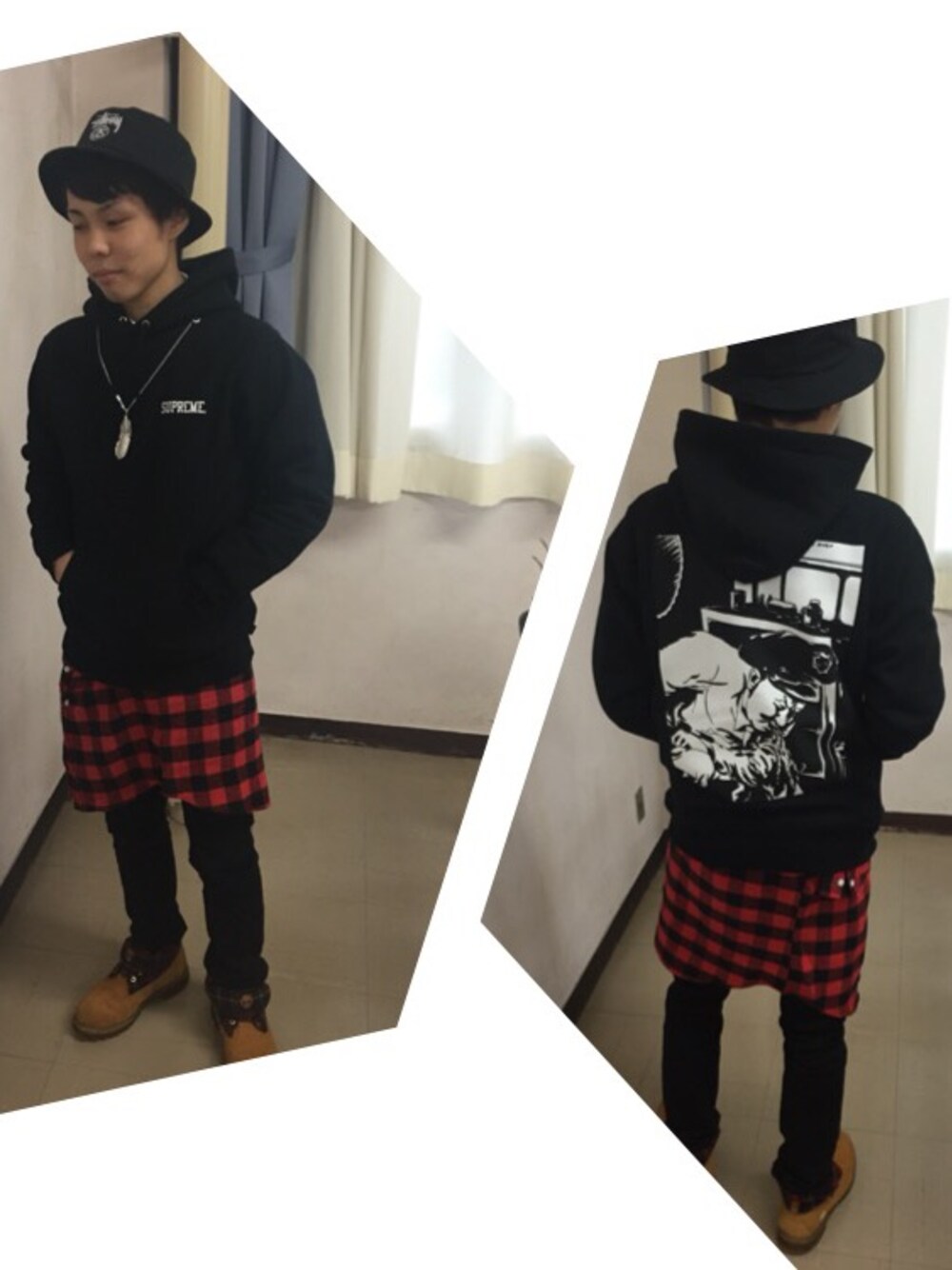 ブラックコーデに赤チェックシャツ腰巻きで差し色。 スカート風に腰巻きしてみました! パーカーはお気に入りのsupreme!