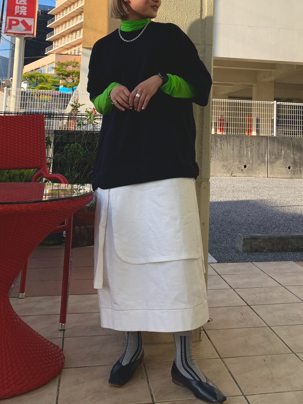 こちらもお気に入りのワンピース グリーンの差し色が良いよね レイヤードしてるように見えるけど全部繋がってるの 裏起毛だからあったかい〜 ネイビーのシューズはアウトレットでゲットしたもの🥿