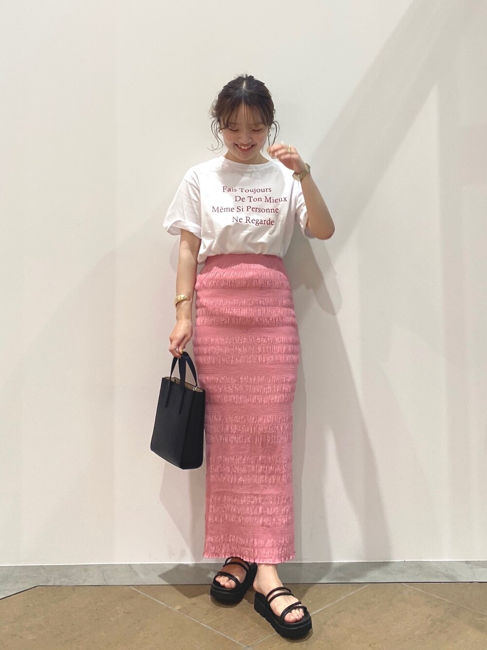 小物を黒で締めてピンクコーデです♡