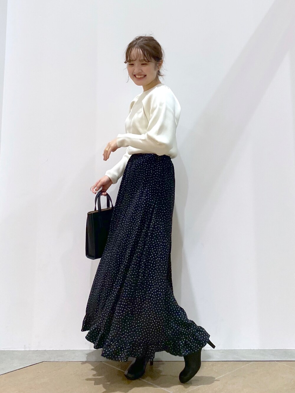 大人コーデです♡♡ モノトーンだけど、可愛らしくしてみました! スカートの落ち感が大人可愛い印象になります´ᴗ`