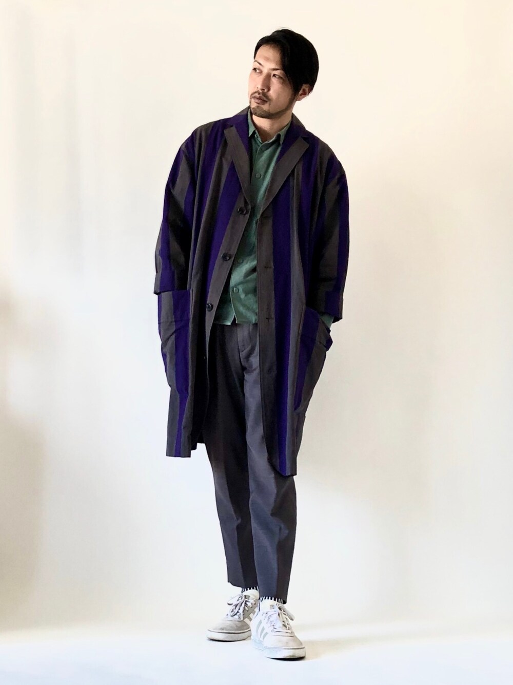 こんにちは。 キレイ目なカジュアルスタイルが好きで、 いつもこんな格好をしております。 アウターはストライプのビッグシルエットのチェスターコート。 インナーにはシャツ。 ボトムはテーパードパンツ。 アクの強いアウターですが、 全体のシルエットのバランスと、 色のチョイスで自然なスタイリングになったんじゃないかなと思います。 白色系のスニカーをチョイスすると、 春らしい雰囲気になると思います。