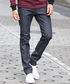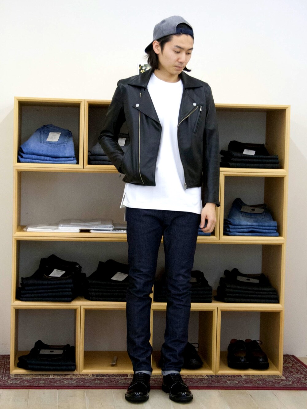ライダースとデニムの王道コーディネート。 インナーにルーズTを合わせ、白を入れることで春らしい爽やかな印象に! 新シリーズのLESSリジットのNARROWは細身のテーパードが綺麗なシルエットになってます!