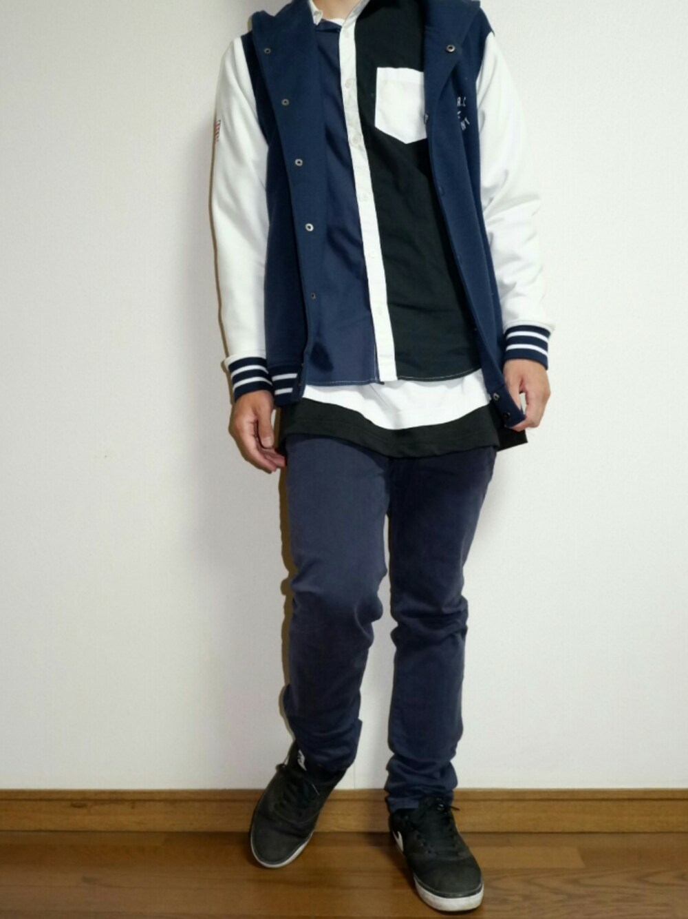 今回はネイビーを意識したコーデになっています。シャツとスタジャンははじめてWEGOに入ったときに買ったものです❗