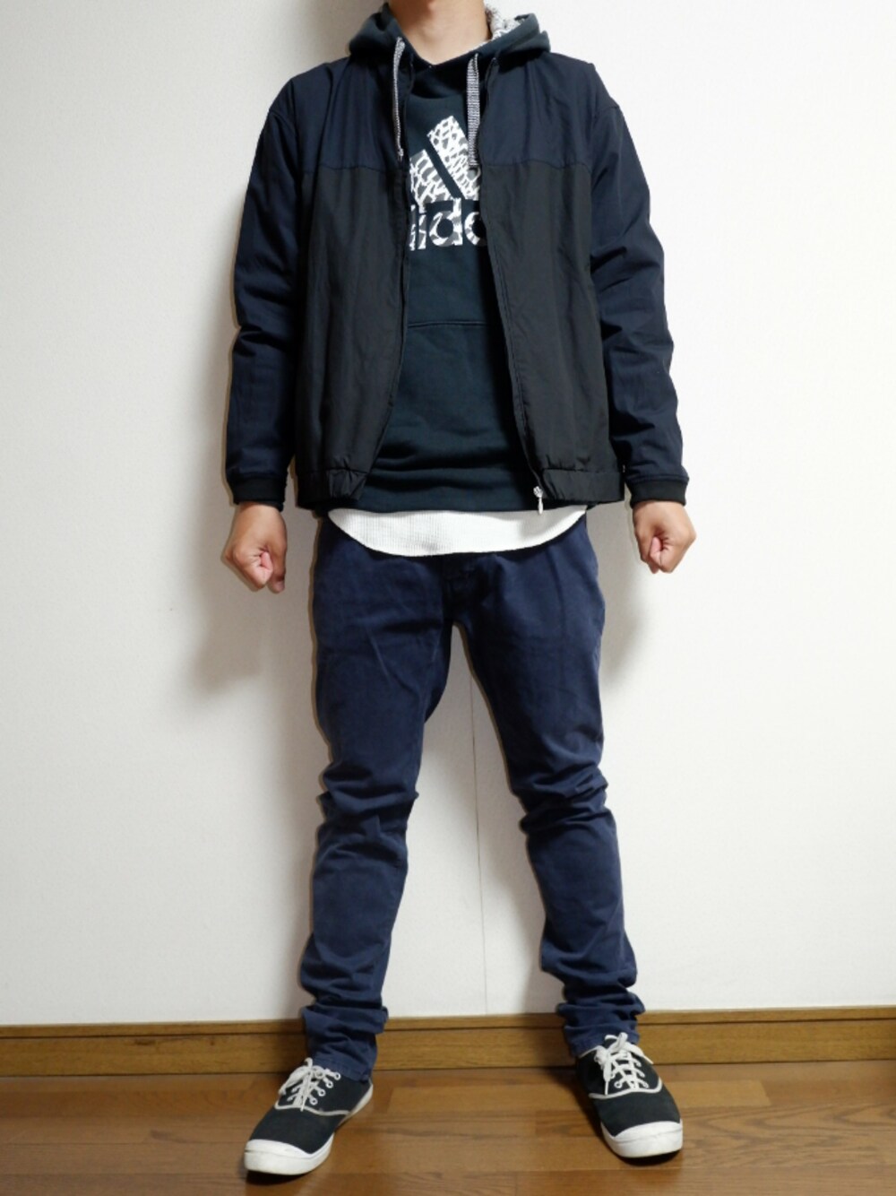 今回は、adidasのパーカーを使ったネイビー系のスポーツミックスコーディネートです!黒のなかに指色で、白のレイヤーを使ってるのがポイントです!✌