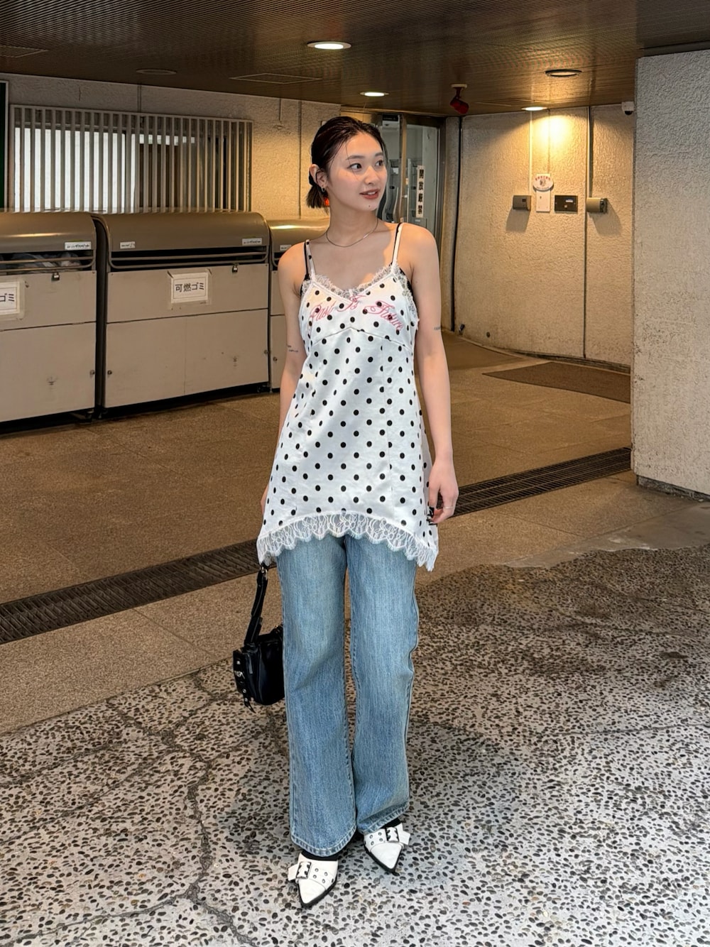 うらのことこ(WHO'S WHO gallery ZOZOTOWN/PALCLOSET店)のワンピース「ロゴサテンキャミワンピ(ドット柄/無地)」を使ったコーディネート