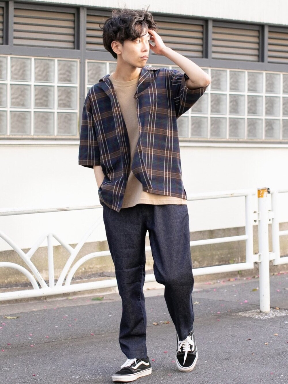 チェックシャツは色味を抑えて。