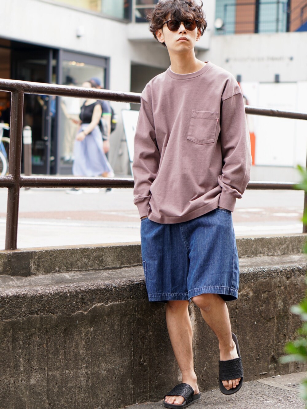 落ち着いたピンクはデニムショーツでアクティブに