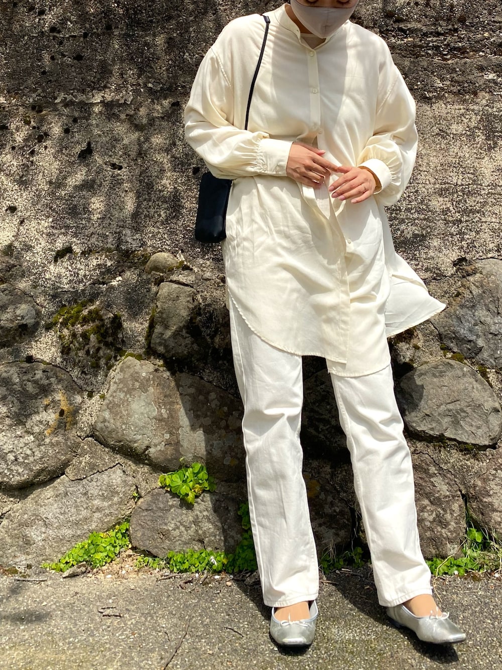 オールホワイトに 足元シルバーで。 暖かいからシャツをサラりと。