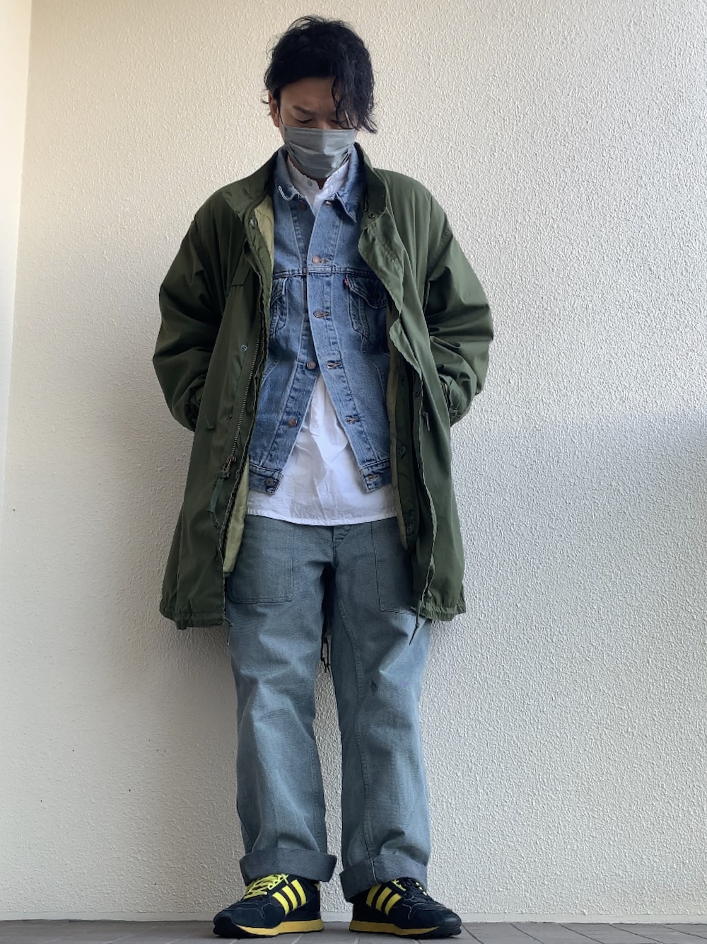 【OUTER】米軍US ARMY M65フィッシュテールパーカー(サイズM) 【TOPS】Levi’sデニムジャケット70507(サイズL) 【INNER】HOUSTON グランパシャツ(サイズL) 【BOTTOMS】スイス軍ヴィンテージデニムワークパンツ(サイズ50) 【SHOSE】adidas ZX 500 OG MITA(サイズ27.0) 《175cm/63kg》