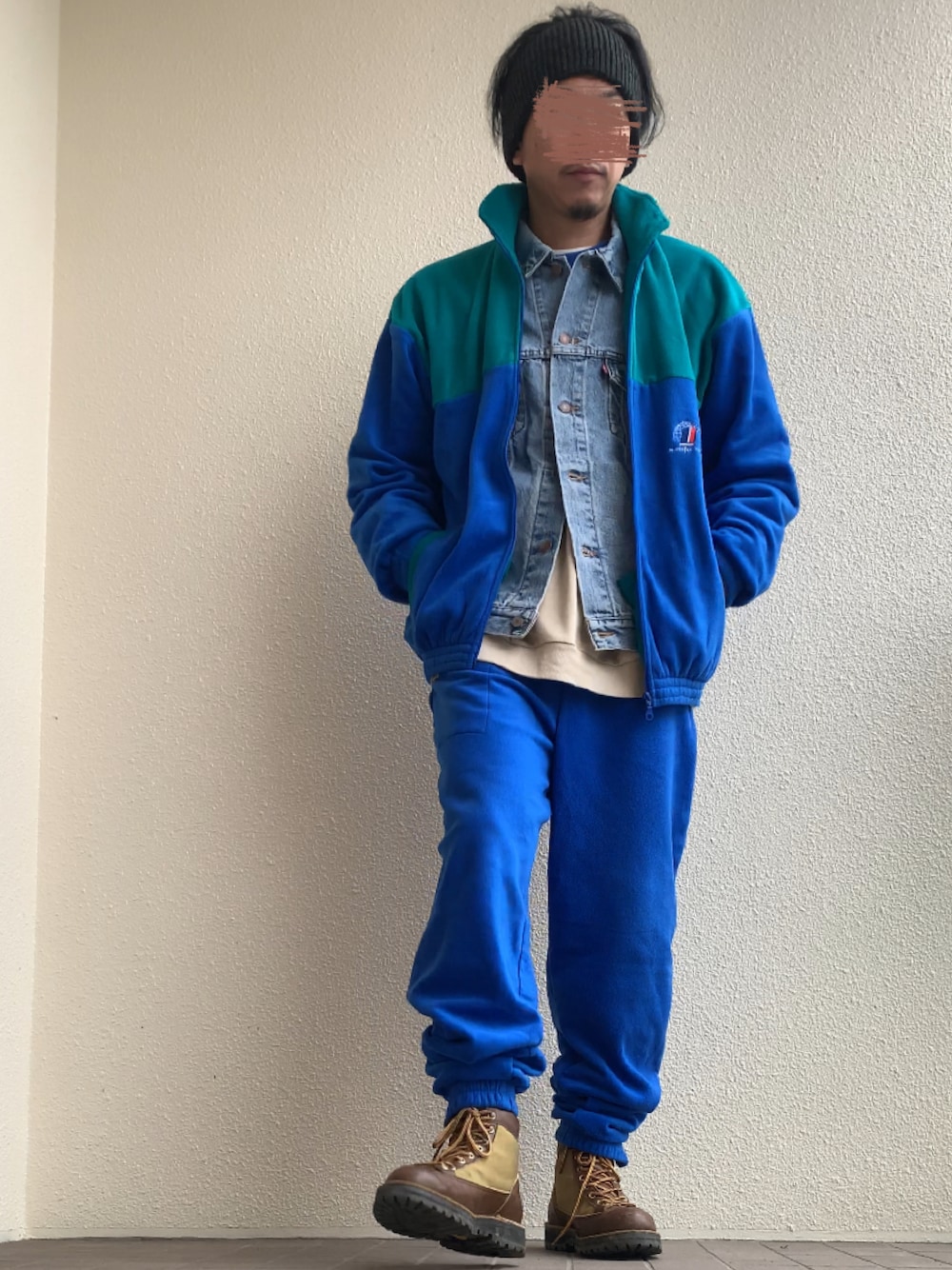 【HAIR BAND】kinema 【SETUP】フランス軍フリーストレーニングセットアップ(サイズ120/108) 【OUTER】Levi’sデニムジャケット70507(サイズL) 【SHOSE】RED WING 9875(サイズ8h) 《175cm/63kg》