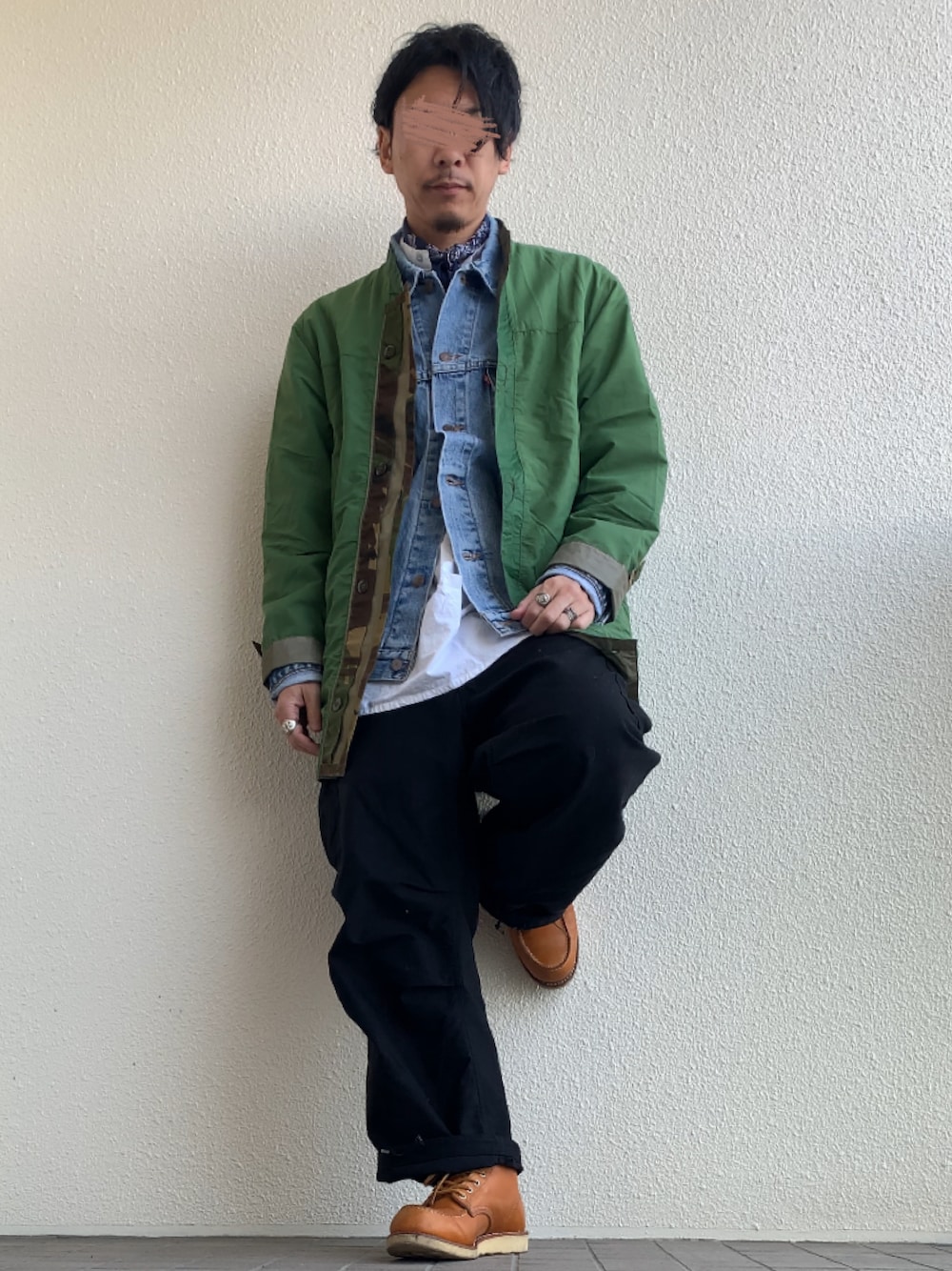 【SCARF】HAV-A-HANKペイズリーバンダナ 【OUTER】オランダ軍ライナーコート(サイズL着丈長め) 【TOPS】Levi’sデニムジャケット70507(サイズL) 【INNER】HOUSTON グランパシャツ(サイズL) 【BOTTOMS】米軍US ARMY M65フィールドカーゴパンツDEEP BLACK染め(サイズM-S) 【SHOSE】RED WING 9875(サイズ8h) 《175cm/63kg》
