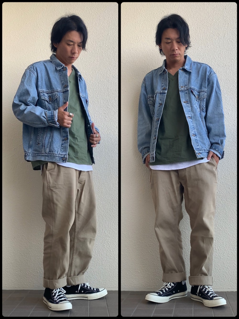 【OUTER】Levi’sデニムジャケット70507(サイズL) 【TOPS】ロシア軍Vネックスリーピングシャツ(サイズ54) 【BOTTOMS】WAIPER.inc M52 WP69(サイズ35) 【SHOSE】コンバースCT70(サイズ9h) 《175cm/63kg》
