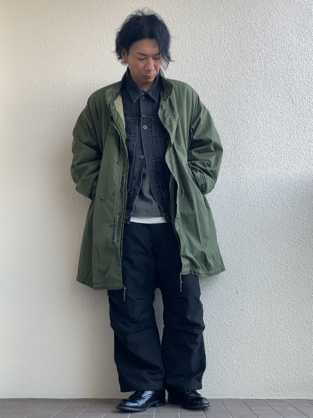 【OUTER】米軍US ARMY M65フィッシュテールパーカー(サイズM) 【TOPS】Levi’s Type1トラッカージャケット(サイズL) 【INNER】ロシア軍スリーピングシャツ(サイズ58-4) 【BOTTOMS】米軍US ARMY M65フィールドカーゴパンツDEEP BLACK染め(サイズM-S) 【SHOSE】米軍USNAVYサービスシューズ(サイズ10)
