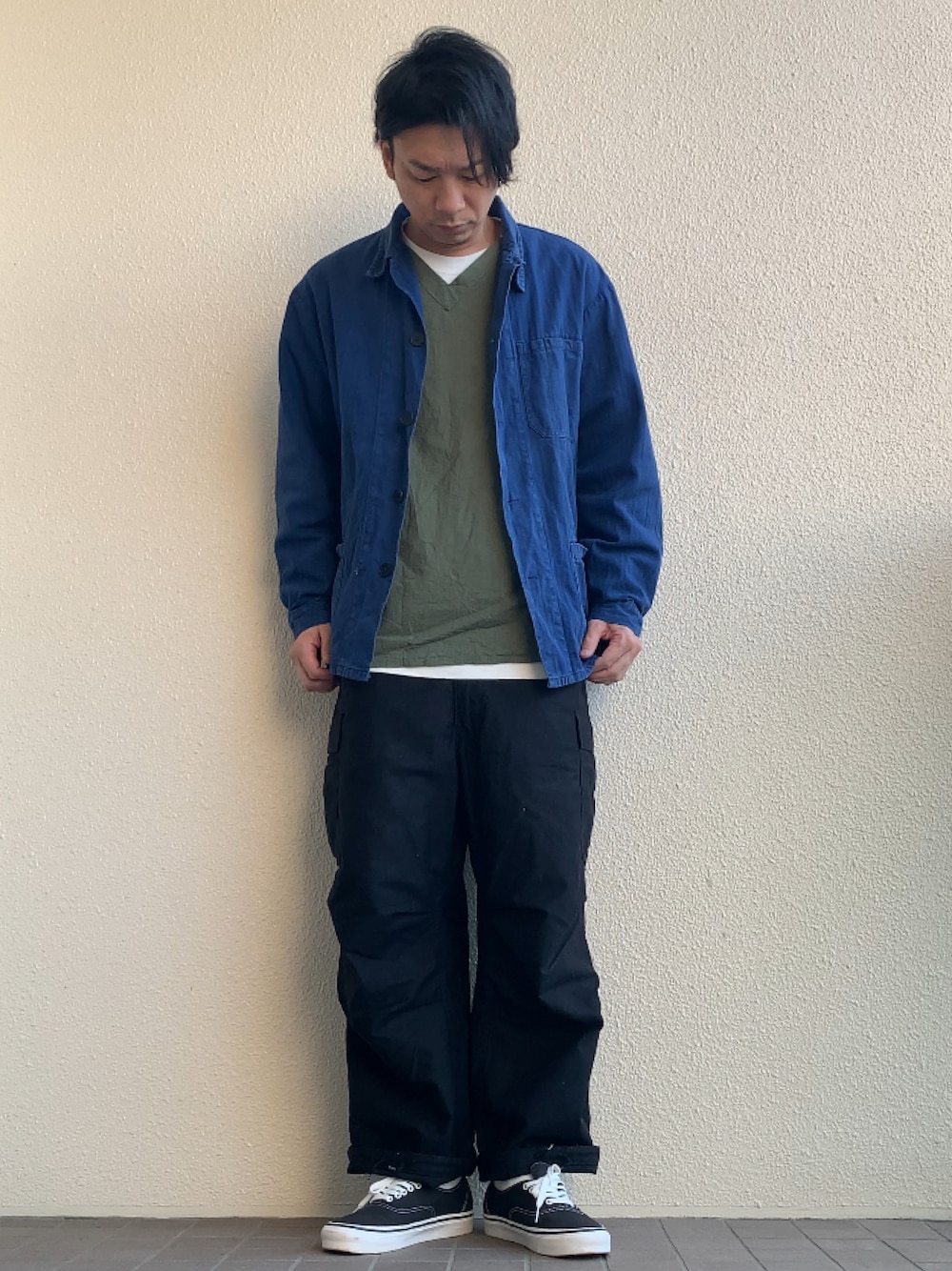 【TOPS】オーストリア軍ヘリンボーンツイルワークジャケット(サイズ104-108 Ⅲ/Ⅳ) 【TOPS】ロシア軍Vネックスリーピングシャツ(サイズ54) 【BOTTOMS】米軍US ARMY M65フィールドカーゴパンツDEEP BLACK染め(サイズM-S) 【SHOSE】VANSオーセンティック44アナハイム(サイズ9h)