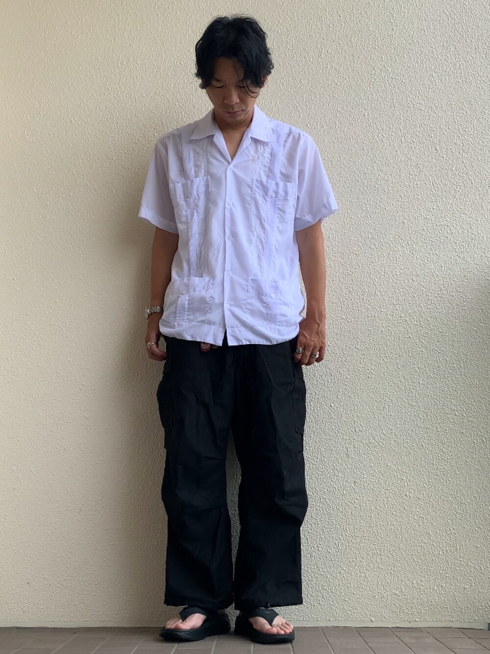 【TOPS】GUAYABERA YUCAキューバシャツ(サイズ40) 【BOTTOMS】米軍US ARMY M65フィールドカーゴパンツDEEP BLACK染め(サイズM-S) 【SANDALS】HOKAリカバリーフリップ(サイズ27.0)
