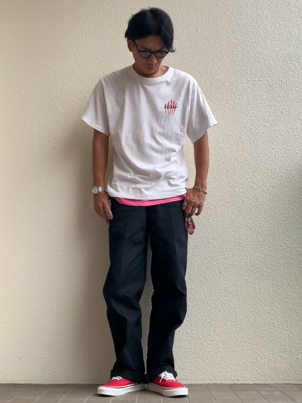 【TOPS】TONY ALVA Tシャツ(サイズL) 【INNER】Good OnポケットTシャツ(サイズL) 【BOTTOMS】BEN DAVISフリスコパンツ(サイズW33L30) 【SHOSE】VANSオーセンティック44アナハイム(サイズ9h) 【EYEWEAR】MOSCOT レムトッシュ(44size)
