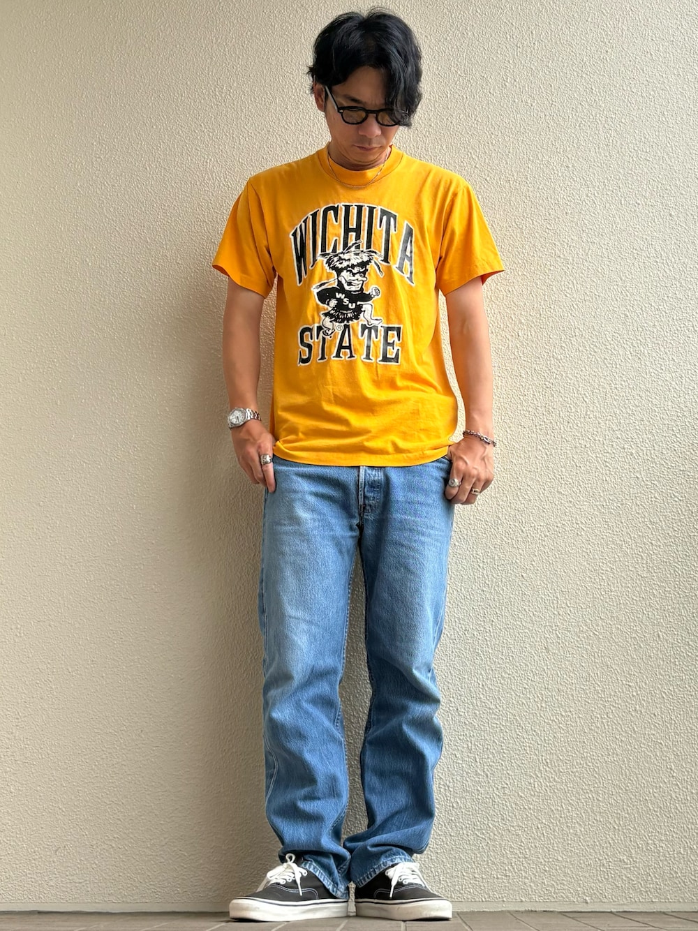 【TOPS】90s USA製カレッジT(SCREEN STARSサイズL) 【BOTTOMS】90s USA製Levi’s501(サイズW33L31) 【SHOSE】VANSオーセンティック44アナハイム(サイズ9h)