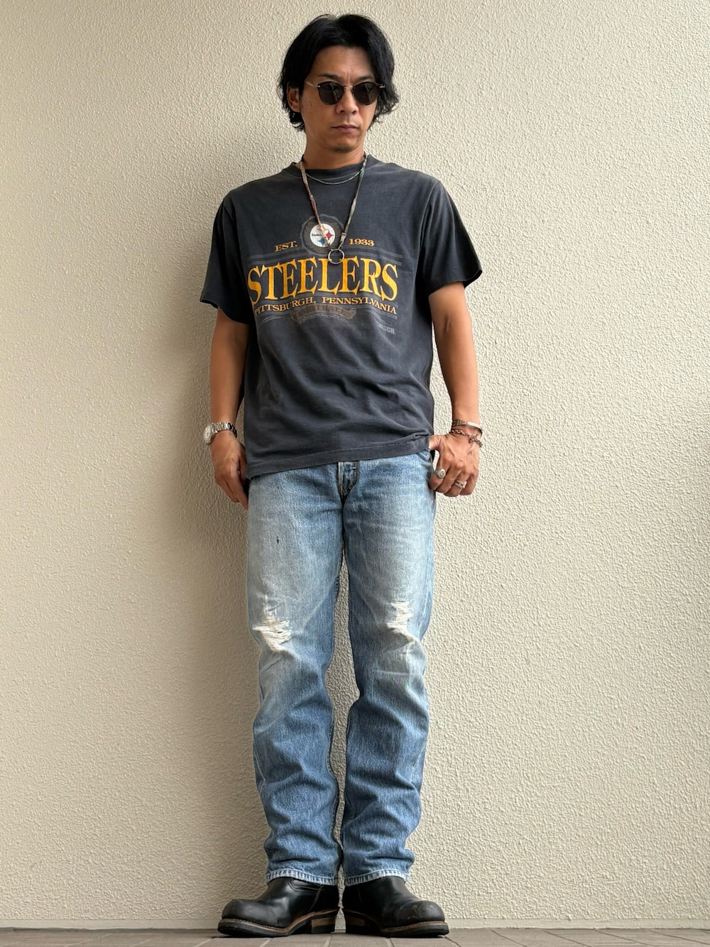 【TOPS】90s USA製(サイズL) 【BOTTOMS】00s USA製Levi’s501(サイズW31L30) 【SHOSE】RED WING 2268(サイズ9) 【EYEWEAR】OLIVER PEOPLES 505