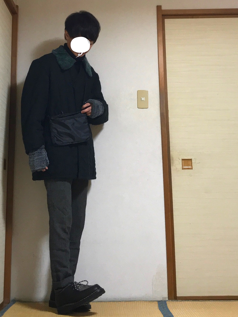 古着屋で一目惚れしたチェコ軍のミリタリージャッケットを使ったモノトーンコーデ⚪️⚫️ 襟元のボアと手袋のボアと靴のファーでモコモコ合わせも意識🤤