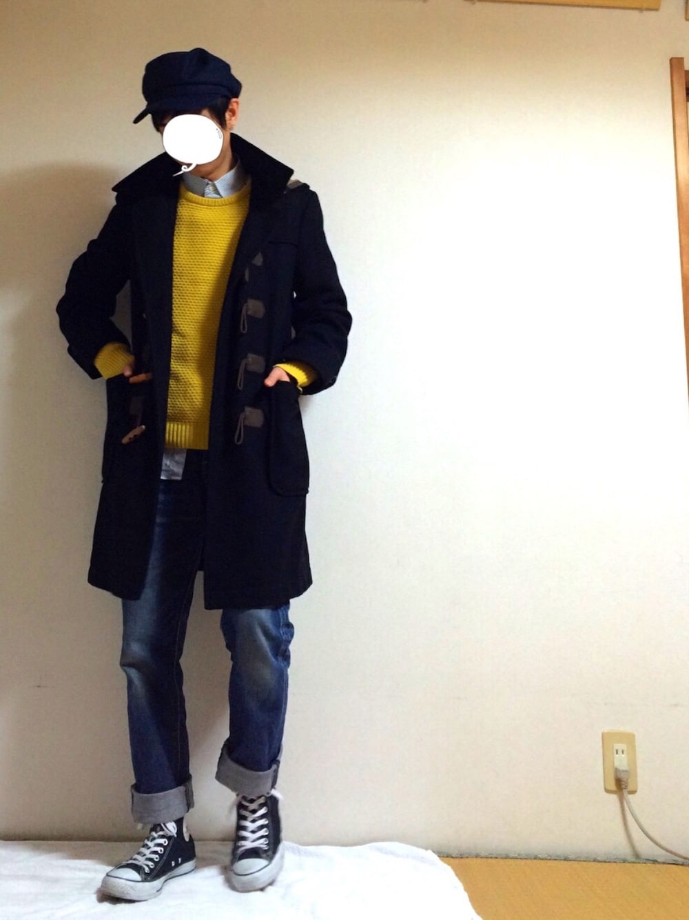 古着のダッフルコートをスクールスタイルっぽく着こなしました。 コンバースのハイカットとデニムは抜群です。