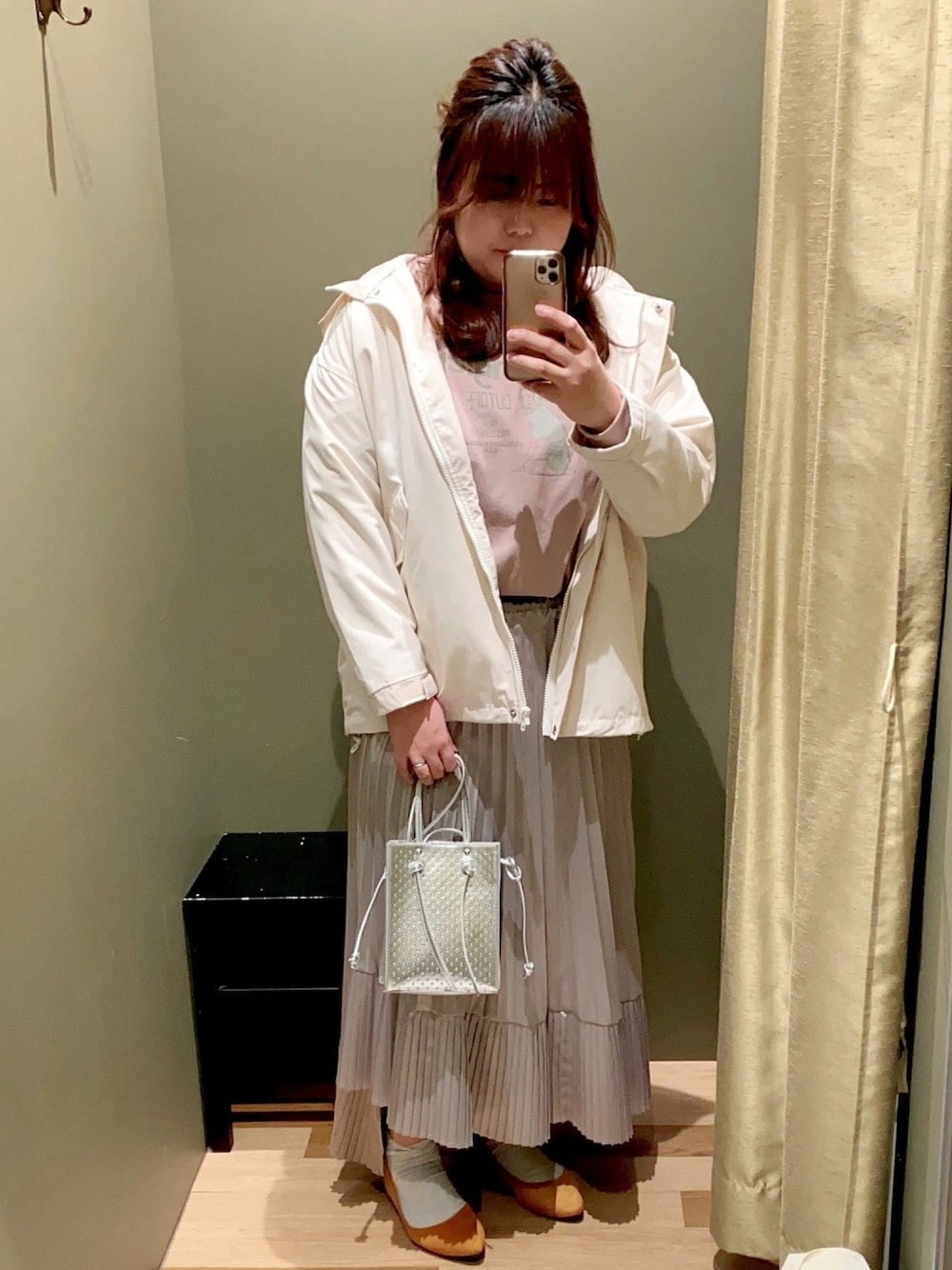 このスカートはイレヘムになっているので 一枚でめちゃくちゃオシャレになります😍✨ 脚がキレイに見えるようなカッティングになっているので ぜひパンプス合わせで脚を出してほしいです🥰🥰 バッグもシルバーにして全体的に綺麗すぎない感じに仕上げました😆❤️