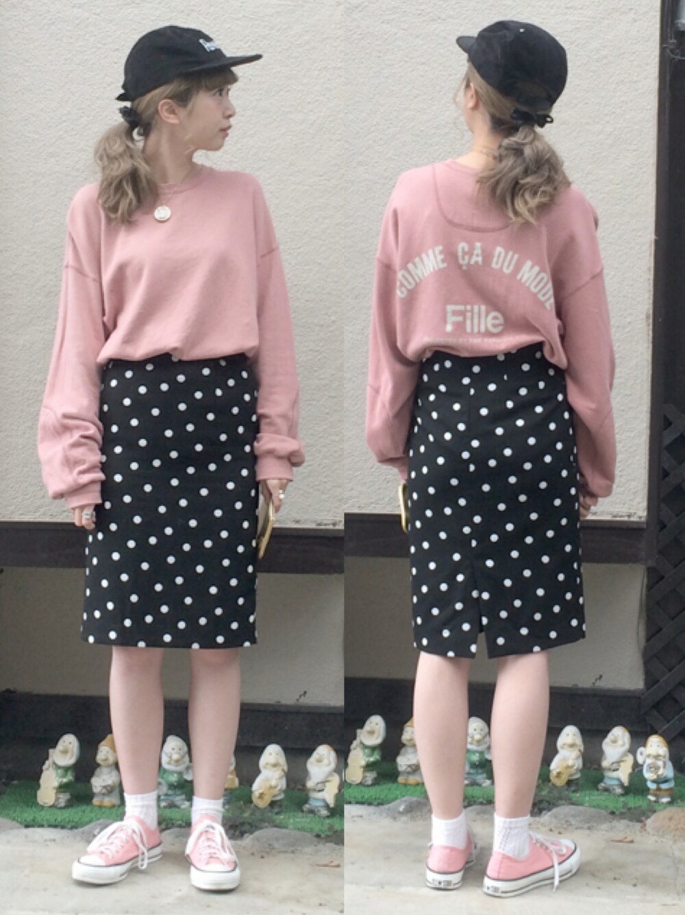 ドットのスカートが 履きやすくてお気に入りすぎ 🎈 スウェットと靴はピンク 他は黒でまとめてみました 🐻🐻 ピンクって本当かわいい 🌷🌸🍧