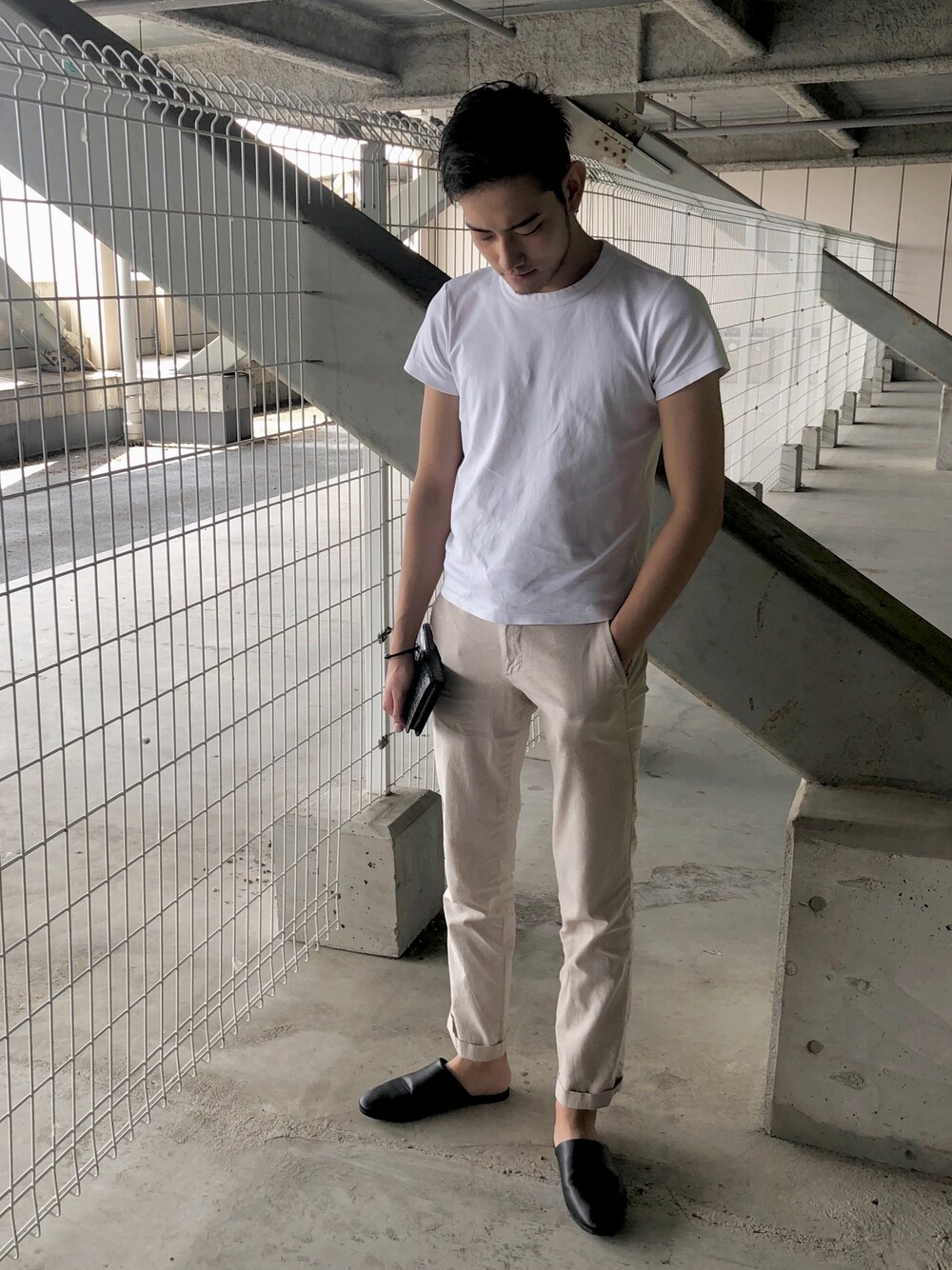 ベージュ×ホワイト 落ち着く色通し パンツはリネンです!! シンプルだけど靴に黒を入れるとかっこよさがでますよね!笑