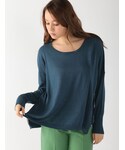 襟ぐりの大きく開いたレーヨン混ニットはさらっと1枚でも、中にシャツを重ねても楽しめますね◎
