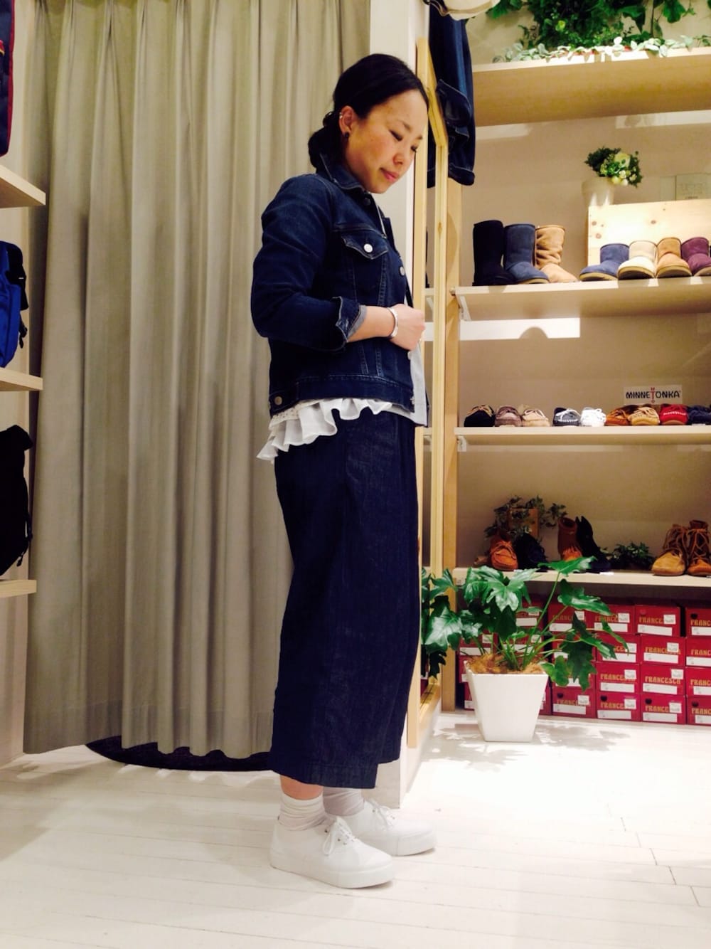 やっぱりデニムが好きです♫ 今日はデニム オン デニム! D.M.G.のGジャンは間違いない着心地の良さ♡ お気に入りガウチョパンツはヘビロテしてます。 インナーには後ろ裾がフリルになったカットソーを。 ちょっぴり甘さを足してみました♡ 足元は入荷したてのkedsの厚底スニーカー。 白でキマリっ♫