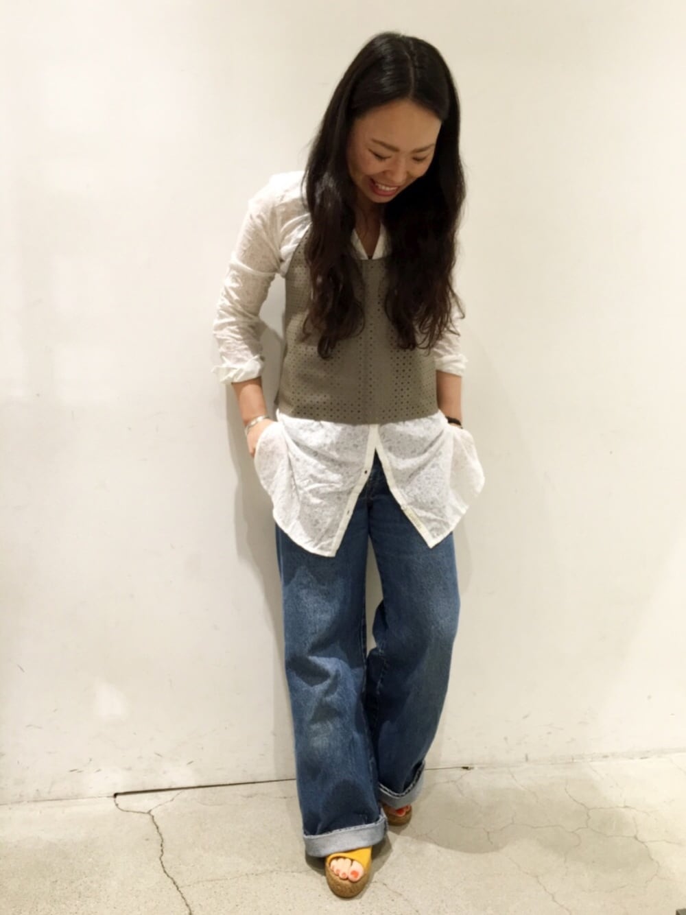今季挑戦したいキャミソールのレイヤードスタイル★ RUMBLE REDのパンチングレザーキャミソールでパンチを効かせました! GANESHのロングシャツも着回し重宝しますよ♩ 足元はGAIMOのラクチンサンダルで🙆