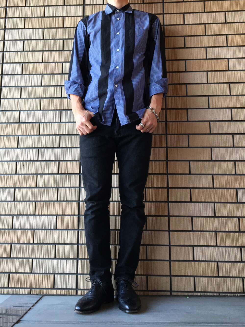 こんばんは🌝 ご覧いただきましてありがとうございます🙇♂️ 今日は綺麗めのコーデで、soeのビッグストライプシャツです。 色合い自体は落ち着いてるんですけど、柄が派手なので一枚でもカッコ良く着れるので黒パンツしか持ってない僕にピッタリなんです👍 靴も革靴で、ウイングチップ内羽根でかっちり目にしました。