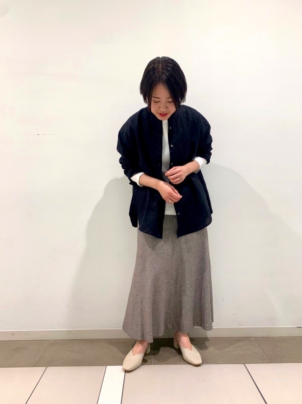 コットンリネンのスカートは、 生地が柔らかく落ち感が出るので シャツを羽織ったスタイルでもスッキリまとまります◎